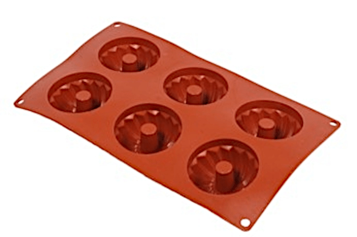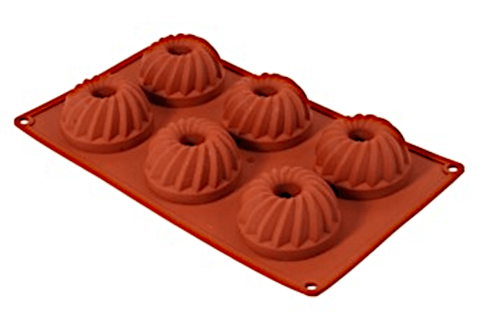 Profesjonalna forma silikonowa do wypieku babeczek z kominem, wymiary zewnętrzne 300 x 175 mm, 6 gniazd Ø 70 mm, głębokość 38 mm.