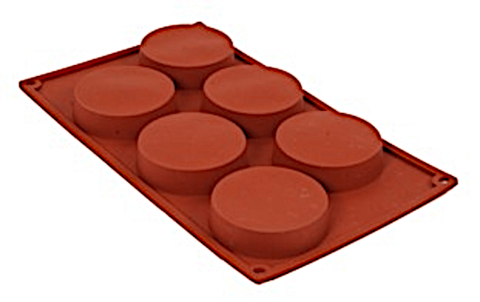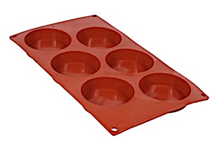 Profesjonalna forma silikonowa do wypieku bułeczek lub garmażerii, wymiary zewnętrzne 280 x 180 mm, 6 gniazd Ø 77 / 72 mm, głębokość 20 mm.