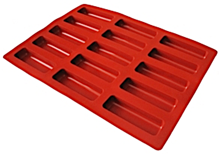 Profesjonalna forma silikonowa do wypieku i gastronomii bułeczka maślana, wymiary zewnętrzne 400 x 290 mm, 15 gniazd 110 x 35 mm, h – 20 mm.