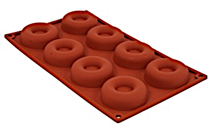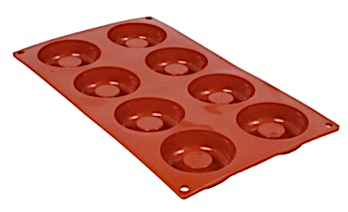 Profesjonalna forma silikonowa do wypieku oponka, wymiary zewnętrzne 300 x 175 mm, 8 gniazd Ø 65 mm, głębokość 20 mm.