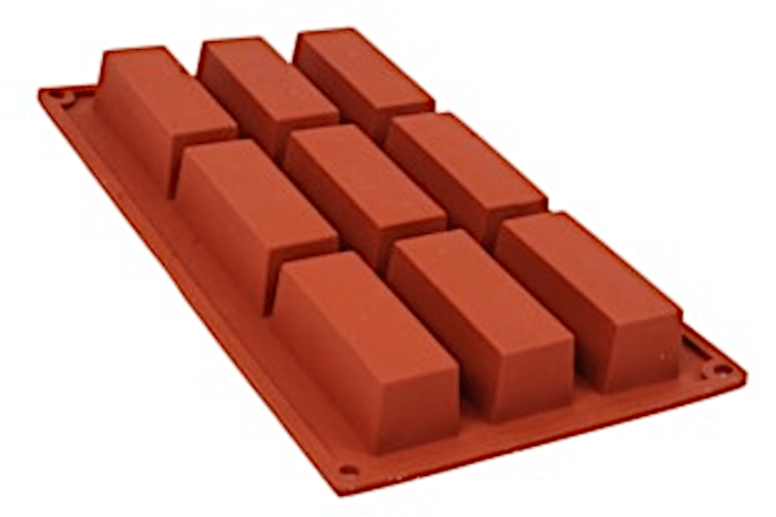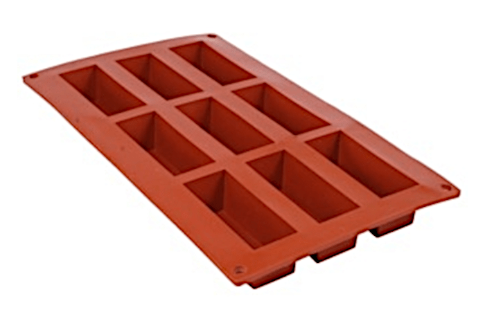 Profesjonalna forma silikonowa do wypieku lub działań gastronomicznych, wymiary zewnętrzne 300 x 175 mm, 9 gniazd o wymiarach 80×40 mm, głębokość 30 mm.