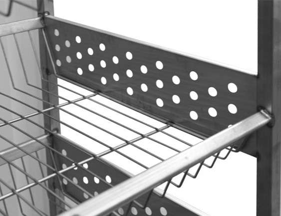 Prezentowany model ma wymiary 150x55x183 cm i został wyposażony w 6 praktycznych półek. Co więcej, odległość pomiędzy nimi wynosi 15 cm. Co pozwala na wygodne rozmieszczenie koszy wypełnionych bułkami. Dzięki temu możliwe jest szybkie i równomierne studzenie wypieków. Co ma ogromne znaczenie dla ich jakości. Albowiem wózek umożliwia transport świeżo upieczonych bułek w obrębie zakładu, zapewniając jednocześnie odpowiednią cyrkulację powietrza.